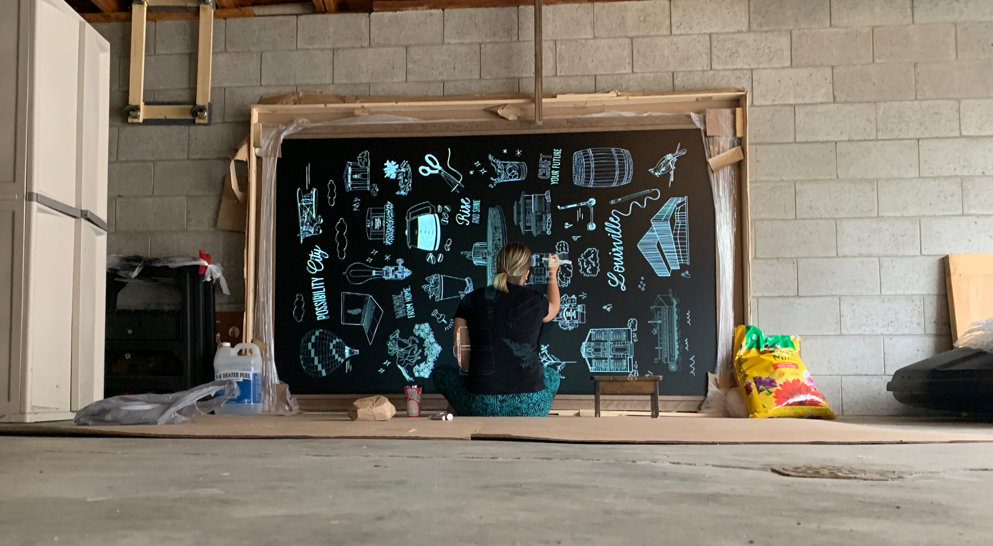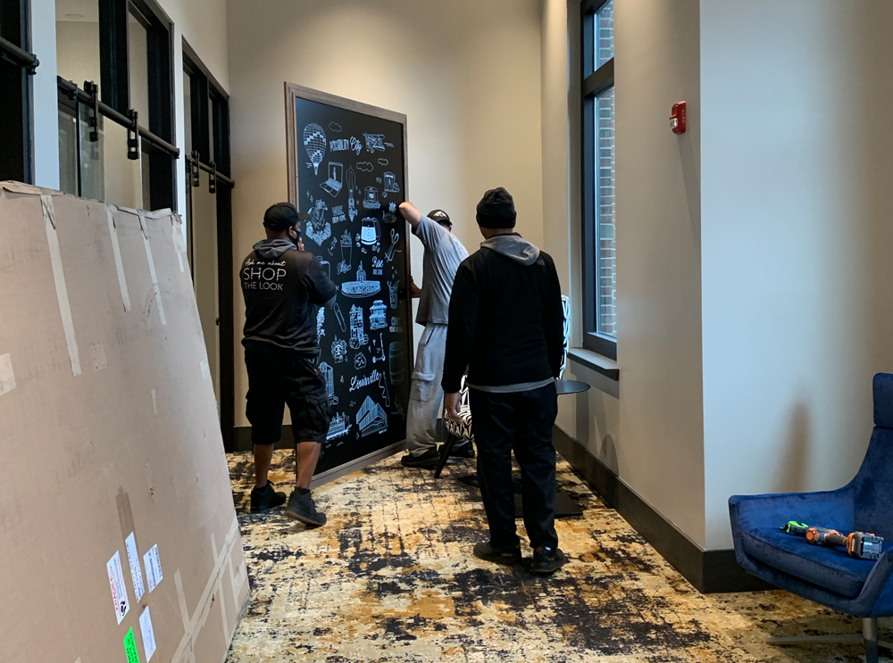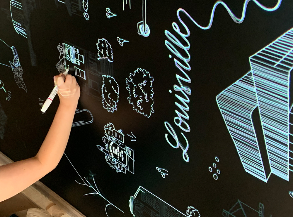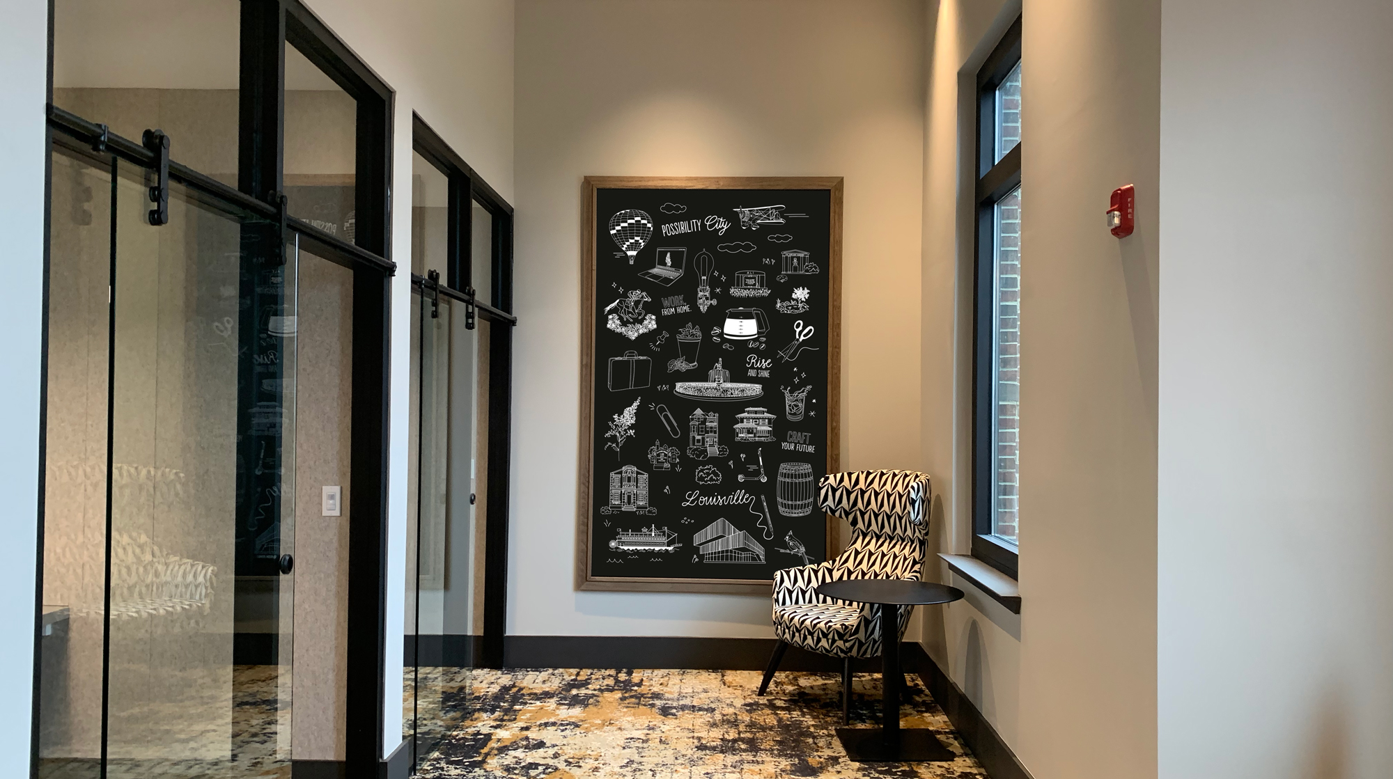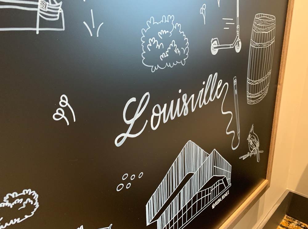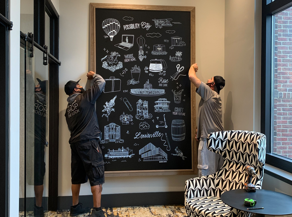 The team of interior designers were working on the development of the community's co-working space and needed mural art to create an inspirational and motivational environment for residents and professionals. The challenge is that the mural design needed to speak to every demographic, since the coworking space will be used by anyone that works from home/remote, which nowadays is a lot of people. It's important that those from Louisville would be able to recognize the drawings, while making newcomers feel welcome.